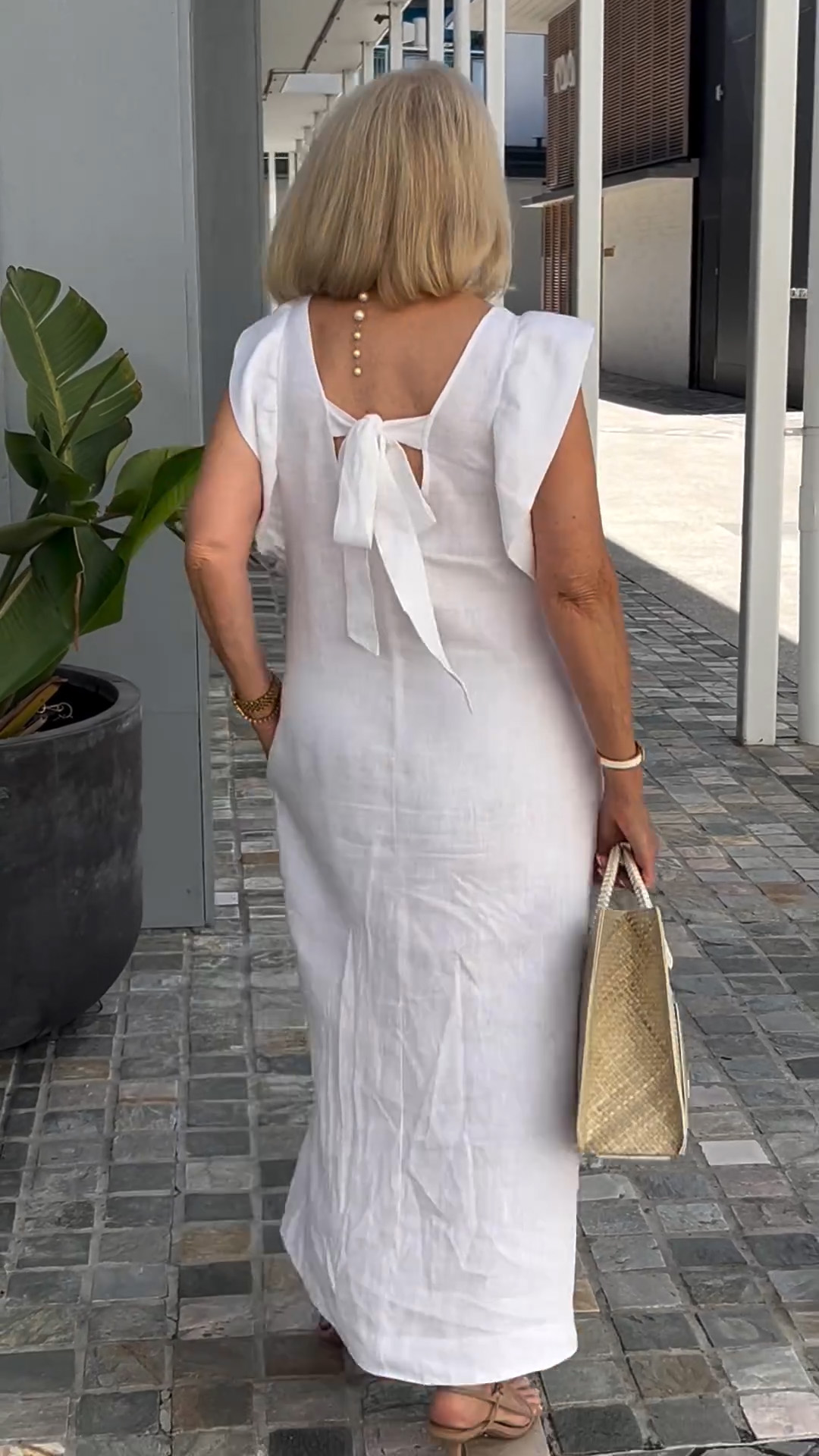 • Mid Length Casual Dress with Ruffle Sleeves,Back Adjustment Rope,Deep Pockets,Pure White Formal Dress, Evening Dress