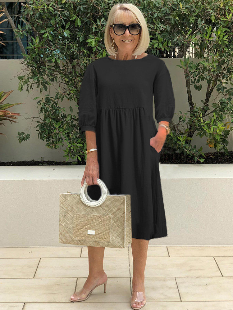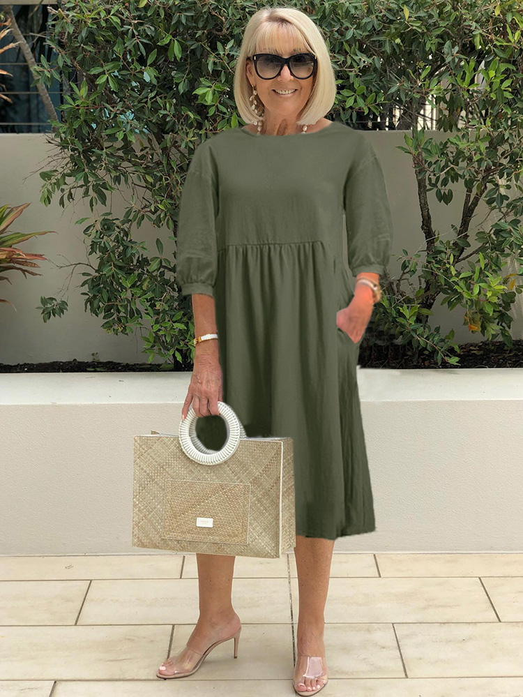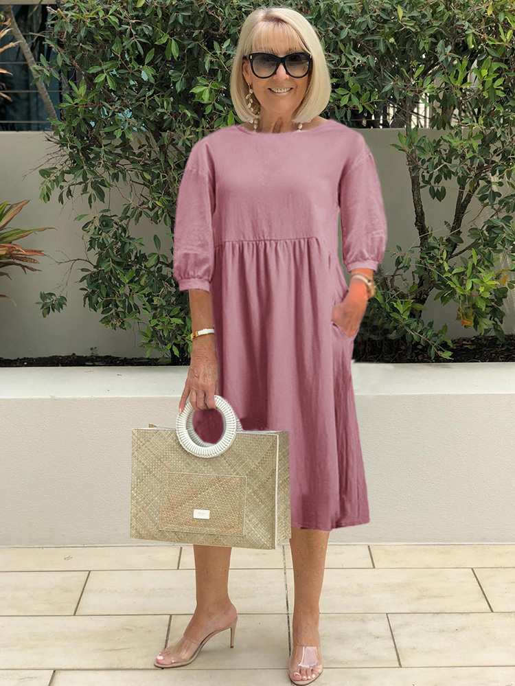 Solid Color Lantern Sleeve Cotton Pocket Midi Tunic Dress