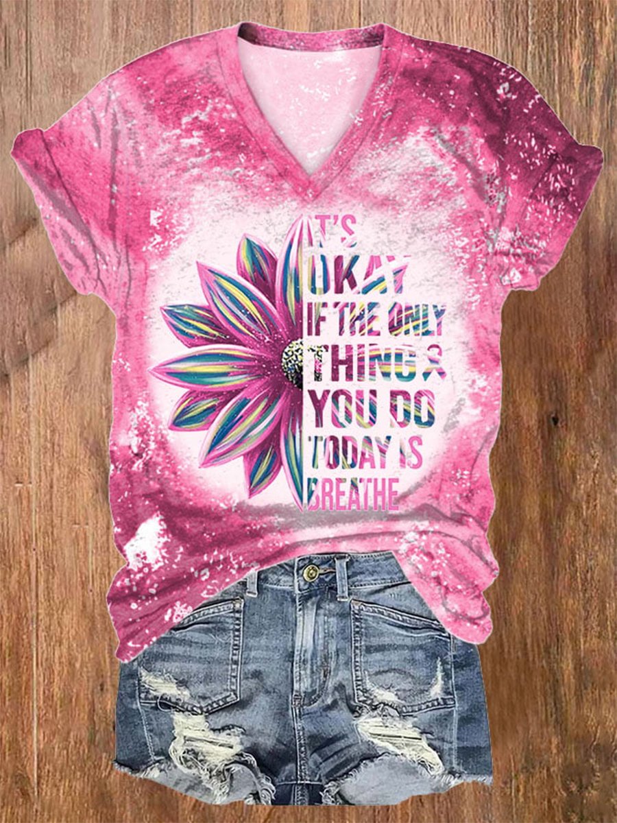 • Breast Cancer Awareness It's Ok Sunflower Inspirational Casual Print T-shirt