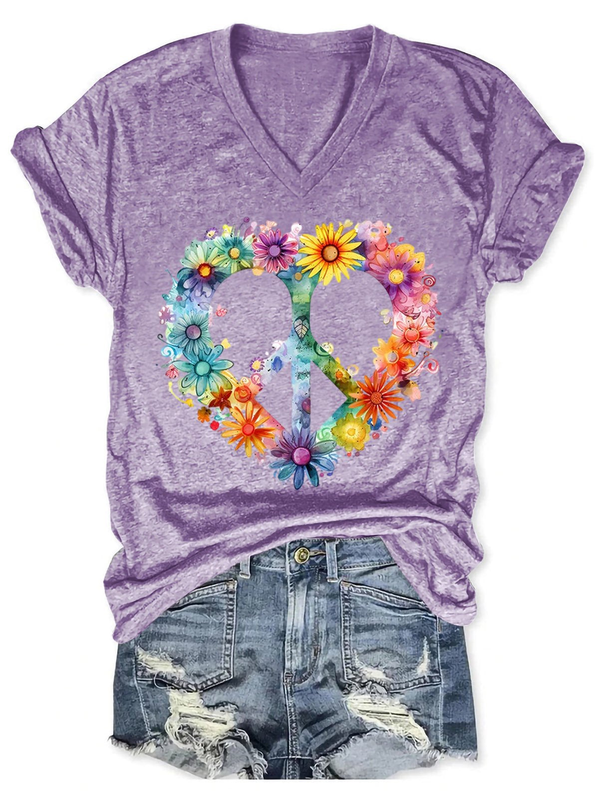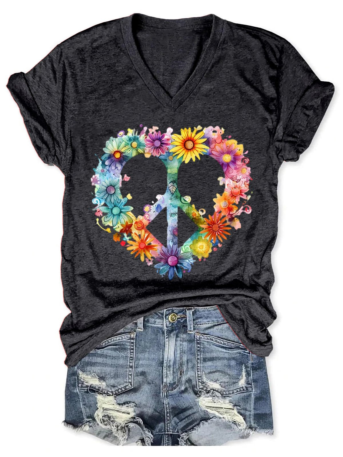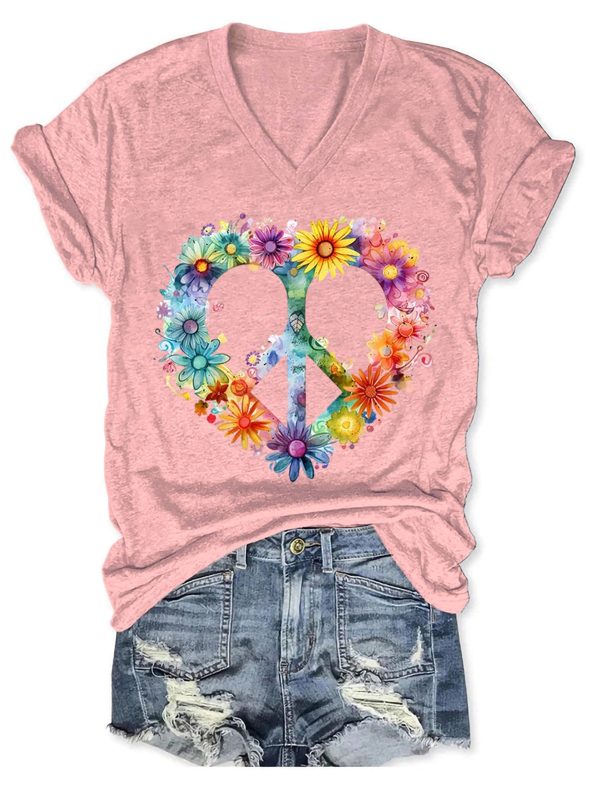 Women's Floral Peace And Love Art Print V-neck Casual T-Shirt