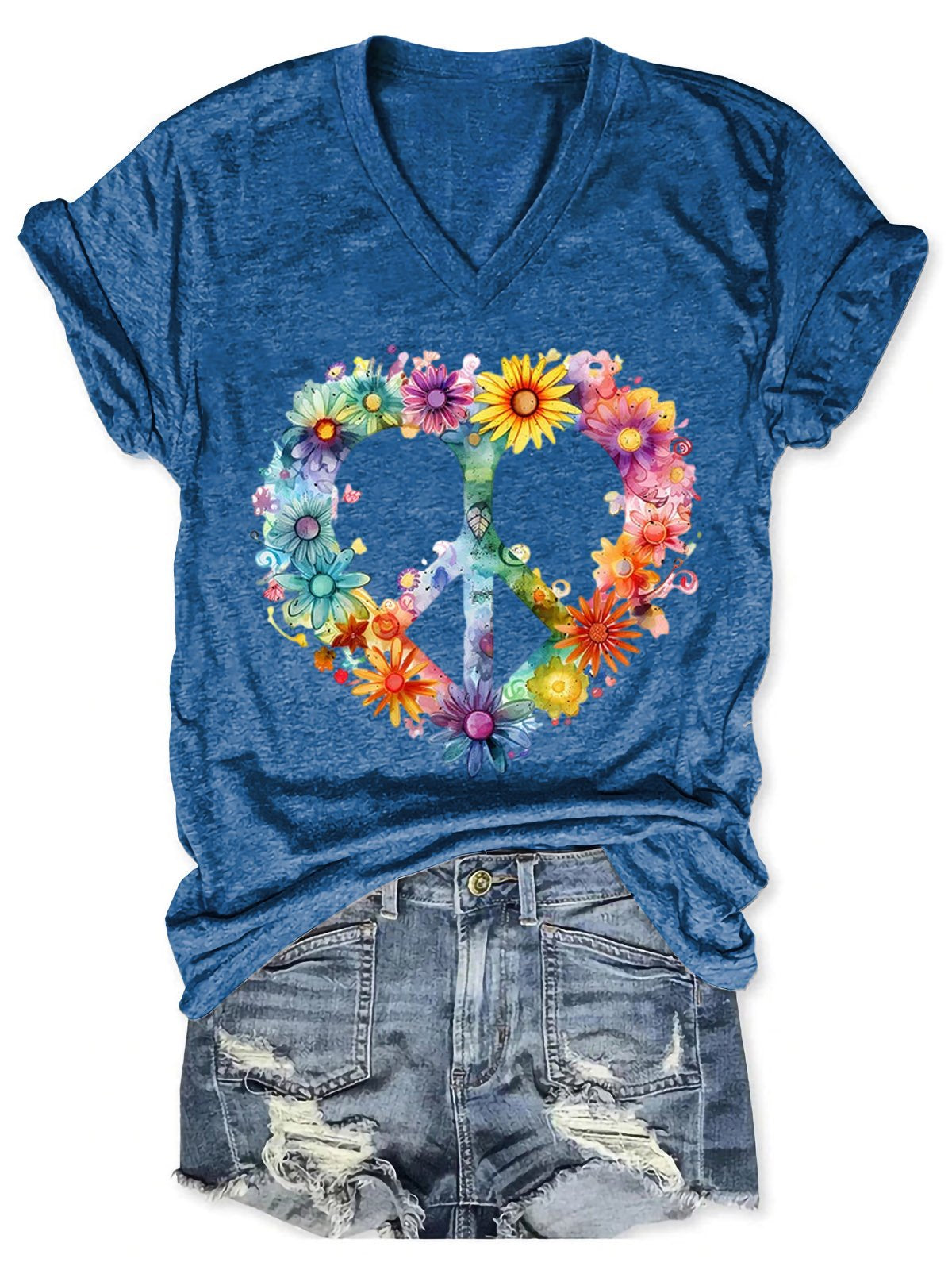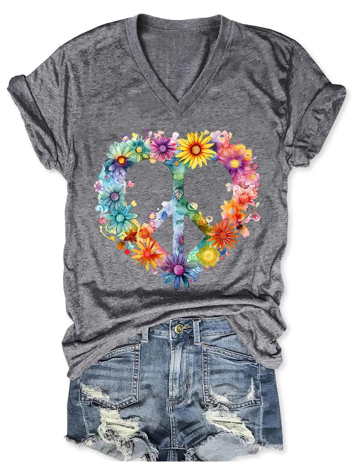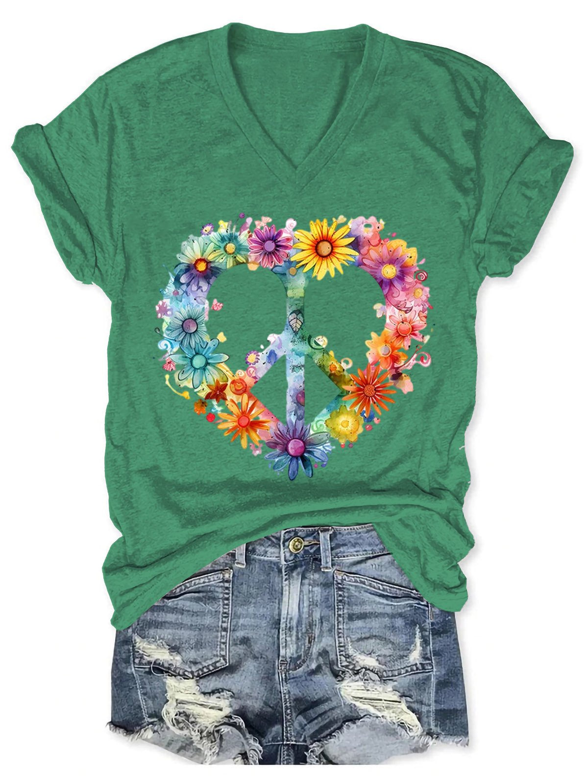 Women's Floral Peace And Love Art Print V-neck Casual T-Shirt