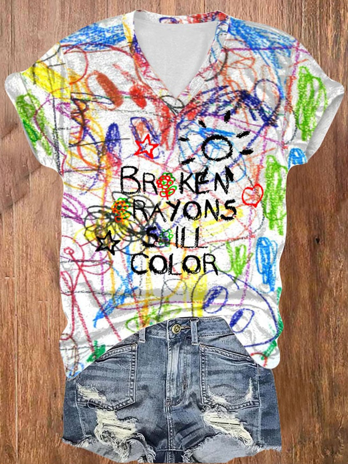 V-Neck Retro Broken Crayons Still Color Print T-Shirt