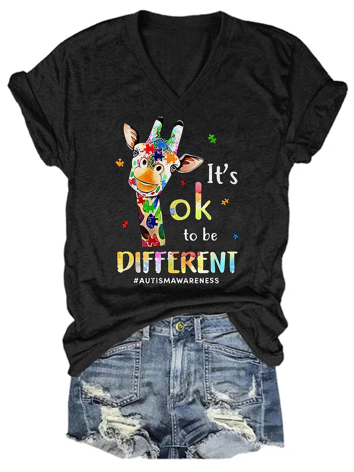 Retro Autism Awareness Giraffe It's Ok To Be Different Casual Print T-shirt