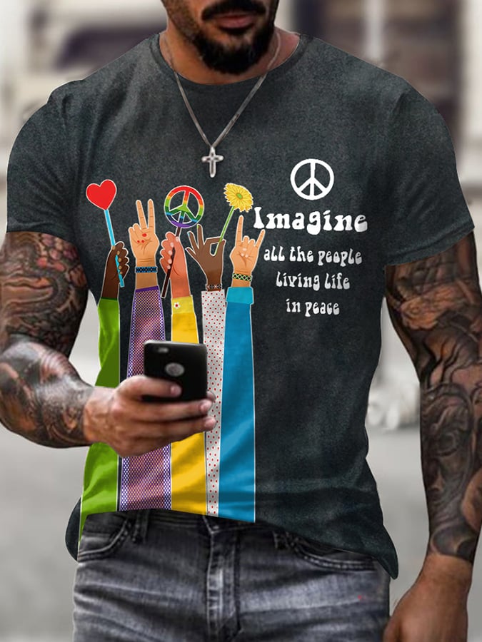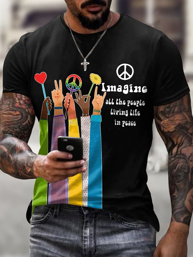 Retro Hippie Imagine All The People Living Life In Peace Print T-Shirt