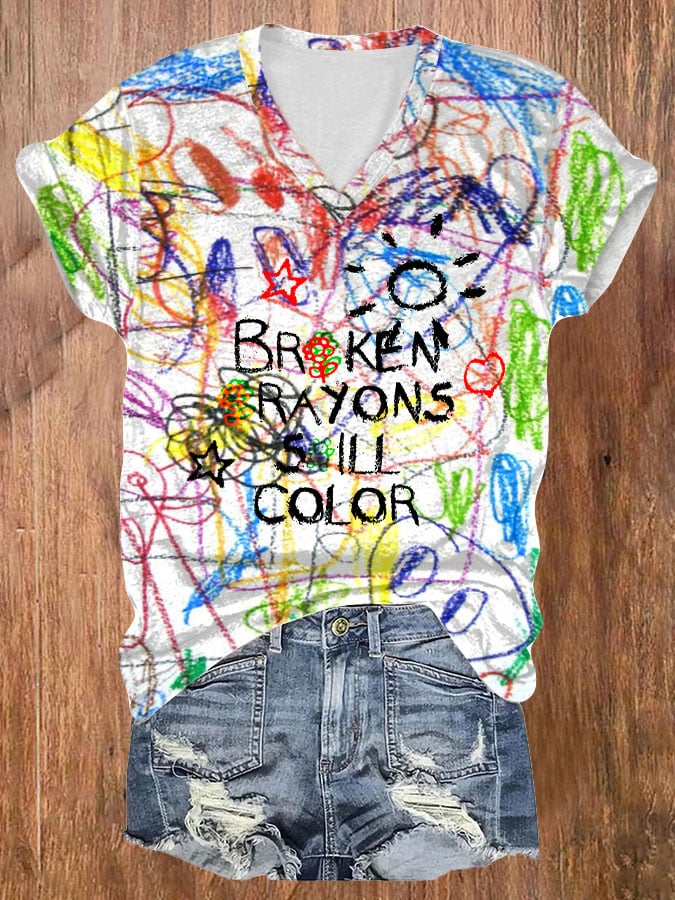 V-neck Retro Broken Crayons Still Color Print T-Shirt