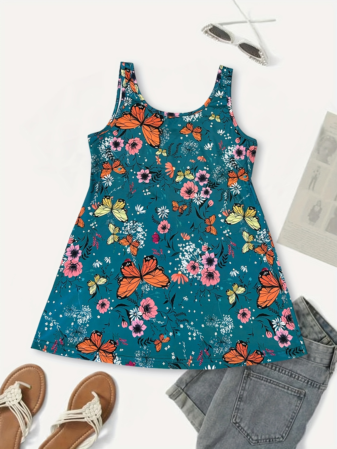 • Butterfly & Flower Print Tank Top, Casual V Neck Sleeveless Flare Top For Summer, Women's Clothing